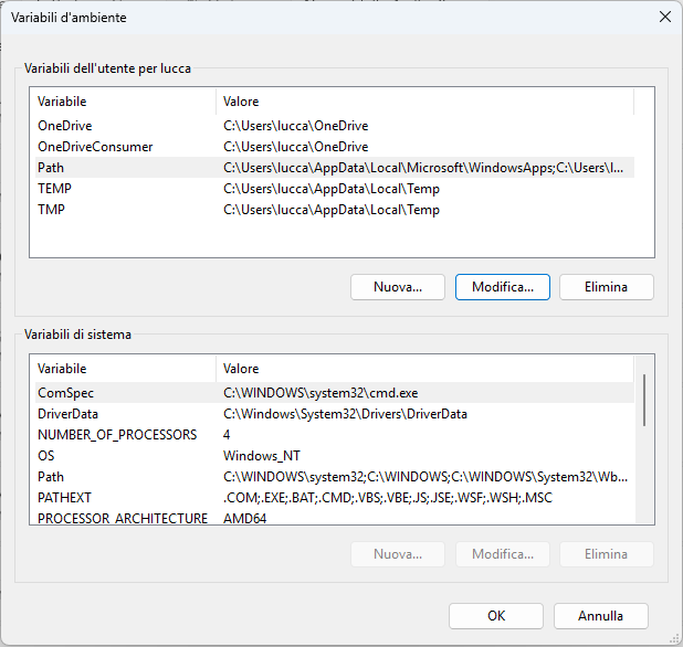 Path del pannello di controllo. I percorsi dei comandi relativi agli strumenti installati seguendo questa guida vanno AGGIUNTI a quelli già esistenti; la modifica dei percorsi già esistenti potrebbe pregiudicare il funzionamento di alcuni programmi. Per testare la corretta installazione dei tools, aprite il Prompt dei comandi (cercate "Prompt dei comandi" nella scheda di ricerca di Windows) e digitate il seguente comando: