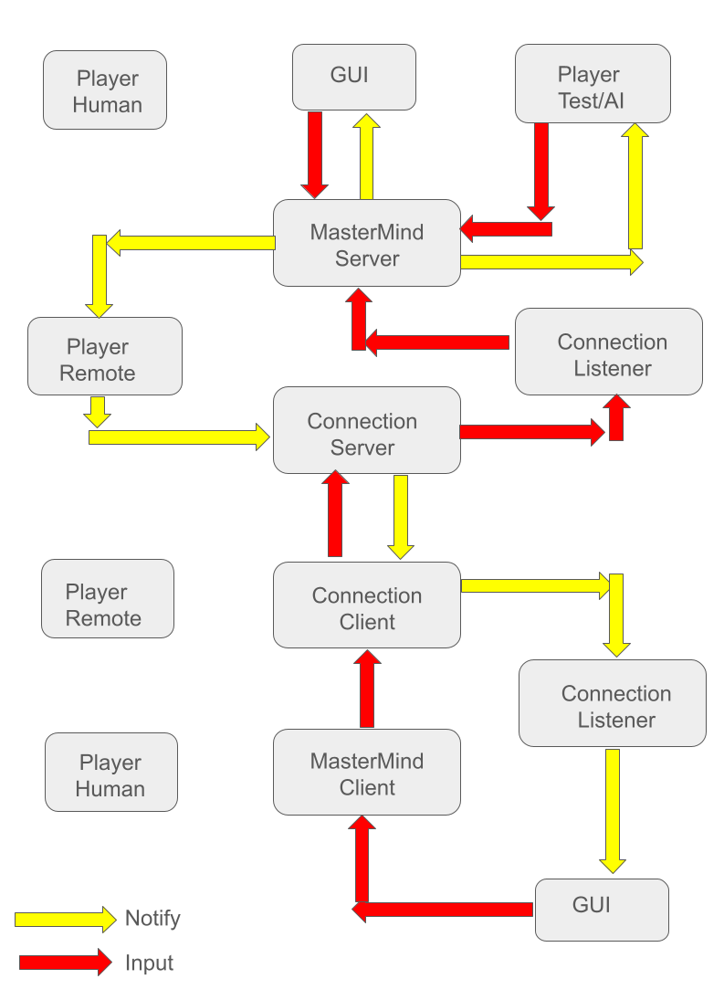 Le linee rosse rappresentano i dati di input cioè le sequenze; una sequenza è la solution e le varie guess ma anche la resa di un giocatore. Come potete facilmente osservare dal diagramma, tutte le linee rosse convergono sul componente MasterMind Server proprio perchè questa è la architettura che ho scelto di implementare.