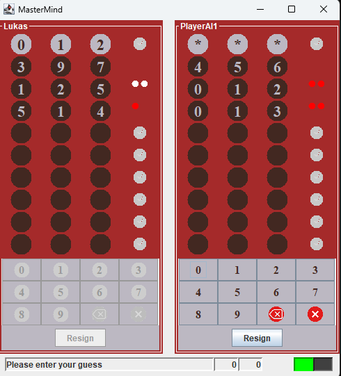 Nella immagine, vi è un giocatore umano (Lukas) che occupa il pannello di sinistra ed un giocatore I.A. (il computer) che occupa il pannello di destra. Il gioco del mastermind è un semplice gioco turn based (basato sui turni) in cui due giocatori scelgono una sequenza segreta di simboli (numeri, lettere o colori) e, a turno, ognuno tenta di indovinare la sequenza dell'avversario.