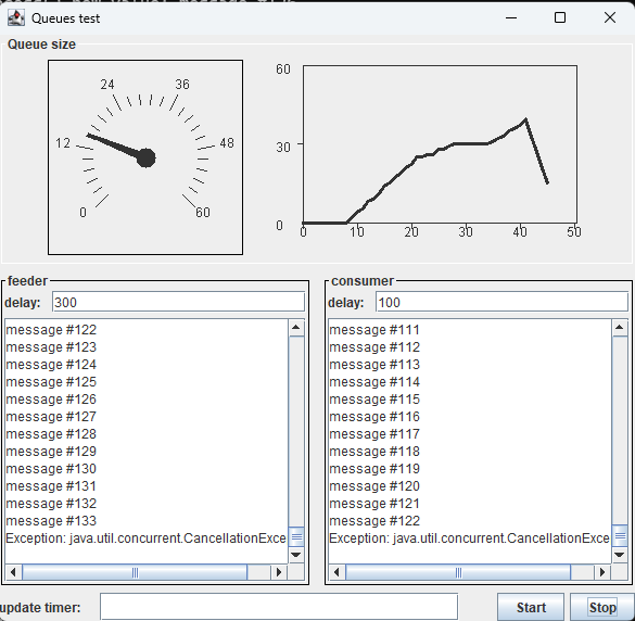 Feeder che alimenta la coda: ad intervalli regolari questo thread genera una stringa di testo "message #X" e la inseirsce in coda; il messaggio accodato viene visualizzato in uno scroll-pane, Consumer che consuma la coda: ad intervalli regolari questo thread preleva un elemento dalla coda e lo visualizza un uno scroll-pane Main) ottiene la dimensione della coda e ne visualizza l'andamento in un componente personalizzato chiamato Speedgauge che ricorda vagamente il tachimetro ed il tachigrafo dei mezzi di trasporto.Poichè gli intervalli di Feeder e del Consumer sono modificabili, appare chiaro che, nella modalità bloccante se il ritardo del feeder è maggiore di quello del consumer, la coda sarà quasi sempre vuota dal momento che il consumer è più veloce del feeder.