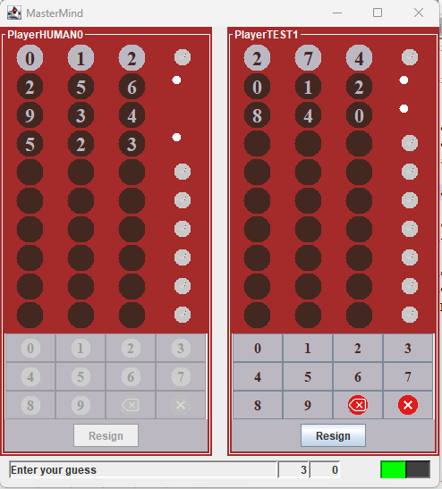 Ebbene, vi è un bug nel codice del PlayerPanel che consente al giocatore umano di "barare" inserendo nella sequenza simboli ripetuti anche se il parametro di gioco repeat=false. Sfrutteremo questo bug in futuro, quindi lo lasciamo.