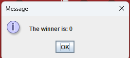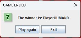 Ci sono però dei casi in cui il metodo che ha gestito l'evento non può rientrare e cedere così il controllo al dispatcher se non dopo che l'user ha fornito una qualche sorta di input. Questo è il caso della fine della partita: quando una partita termina, il server di gioco invia la notifica alla GUI richiamando il metodo notifyEndGame il quale visualizza una finestra di dialogo in cui viene evidenziato il nome del vincitore, se esiste un vincitore.