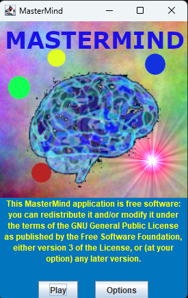 In realtà, la applicazione Mastermind è piccola ed il pannello principale contenente le componenti della partita verrebbe visualizzato immediatamente anche su macchine non particolarmente potenti. Cionondimeno, realizzeremo una sorta di splash-screen anche per Mastermind ma, al contrario di quelli delle app di grandi dimensioni, quello che scriveremo avrà bisogno del click di un bottone di comando per far partire la prima partita (altrimenti non lo vedremmo nemmeno, lo splash-screen). Inoltre, tramite lo splash-screen diamo la possibilità allo user di modificare i parametri di gioco.